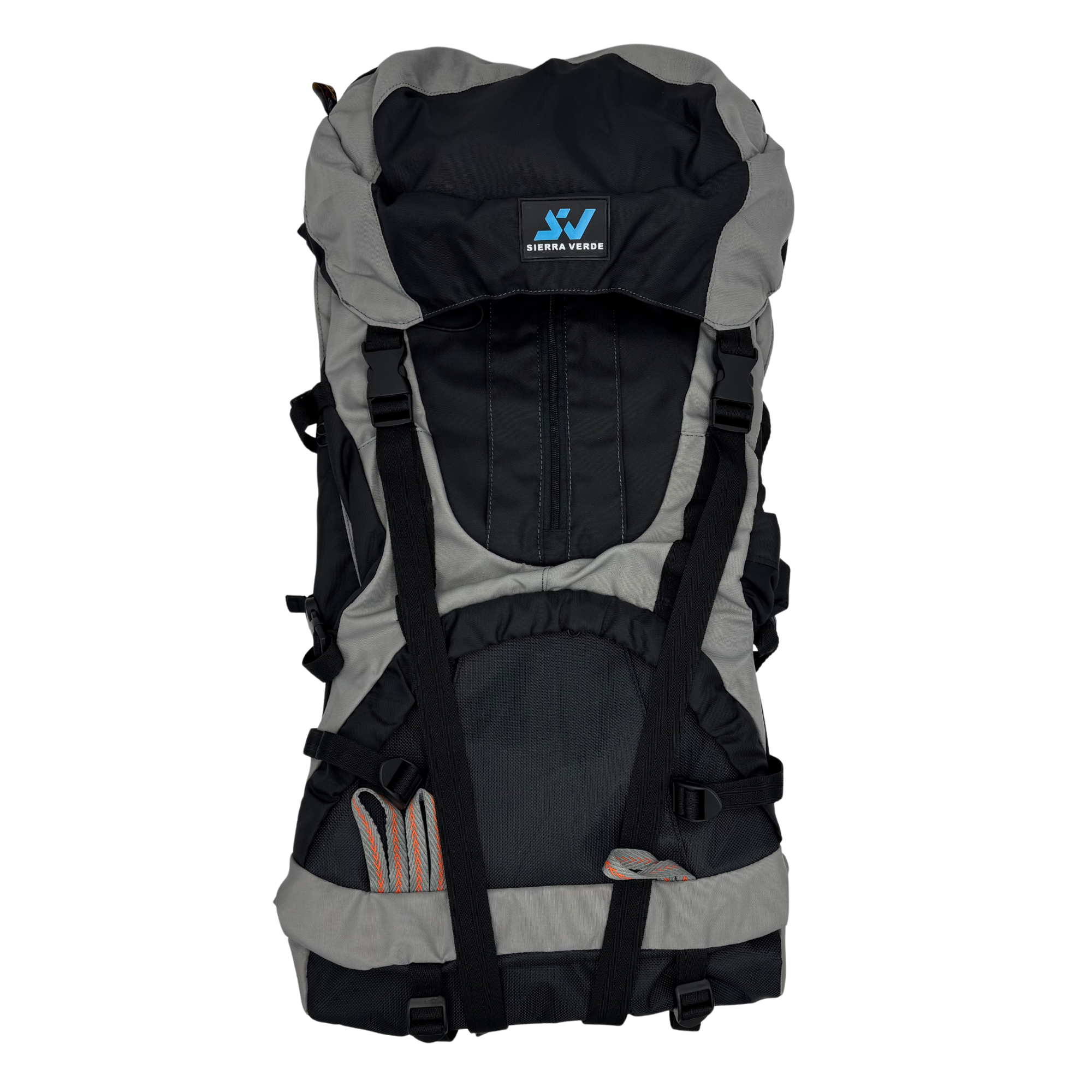 Características: Mochila tipo costal, acceso lateral y superior, compartimiento para bolsa de hidratación, bolsa frontal, cintas laterales de compresión, porta piolets y cintas para bastones telescópicos, con cargadores fijos ergonómicos, faja y respaldo acolchado con varillas ergonómicas de aluminio. Gorro flotante.